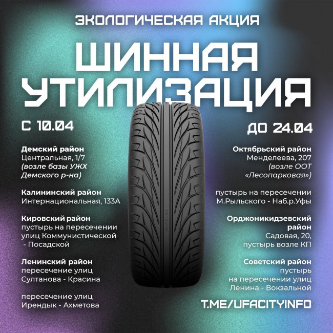 С 10 по 24 апреля в Уфе пройдет экологическая акция «Шинная утилизация» в рамках месячника по санитарной очистке и благоустройству территорий города. В ходе нее организуют сбор отработанных шин от физических лиц и управляющих компаний, которые могут привозить и передавать на утилизацию покрышки, в том числе и с общественных территорий: дворов многоквартирных жилых домов, улиц частного сектора, несанкционированных свалок.